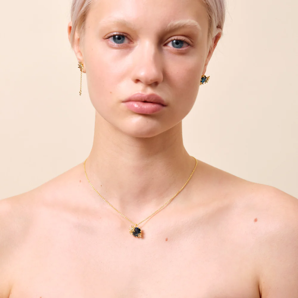 Inspirat de celebra pictură „Noapte înstelată” a lui Van Gogh, acest colier delicat îmbină subtil arta cu eleganța. La capătul unui lanț fin placat cu aur, o superbă piatră tăiată din sticlă albastru-închis evocă paleta misterioasă a nopții pictate de maestru. Stelele aurii care înconjoară piatra adaugă o notă rafinată și poetică.