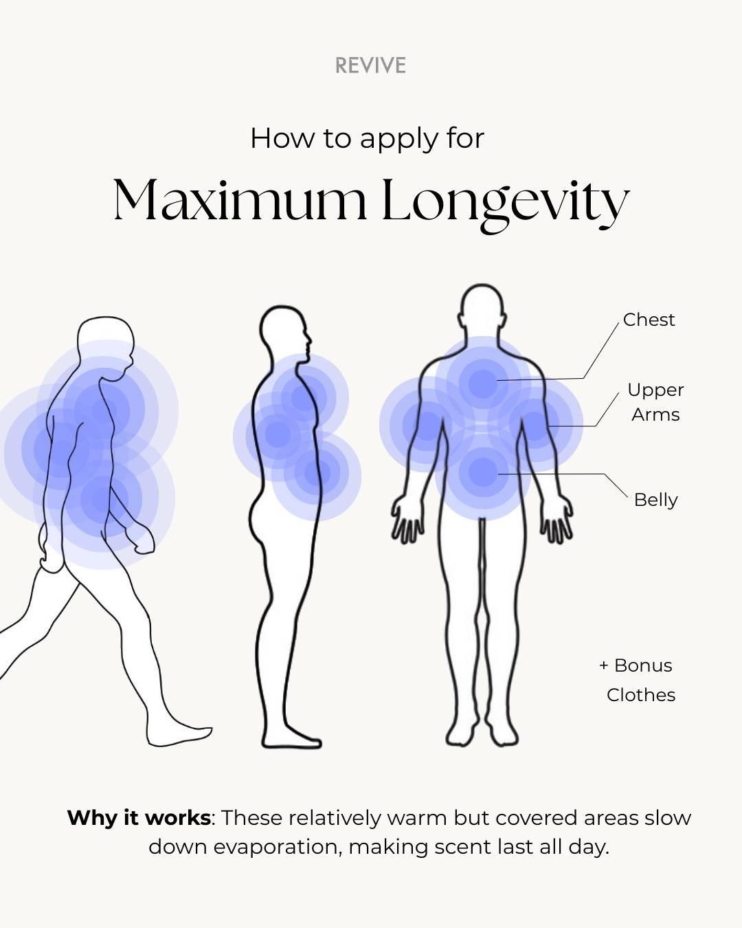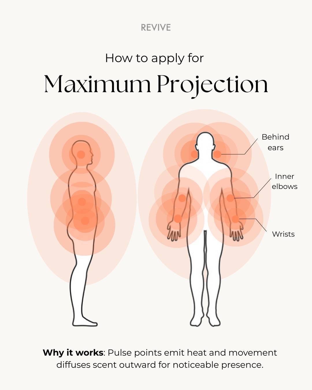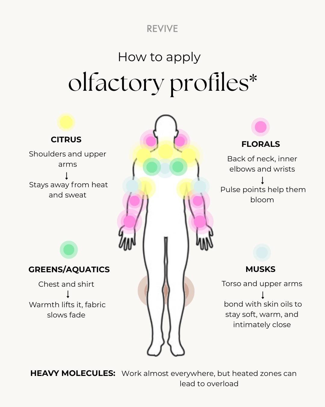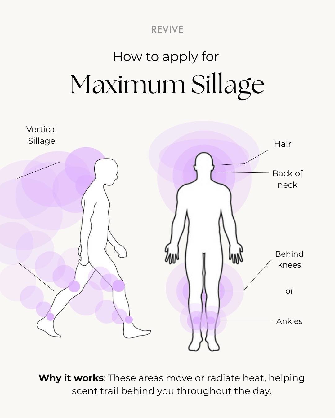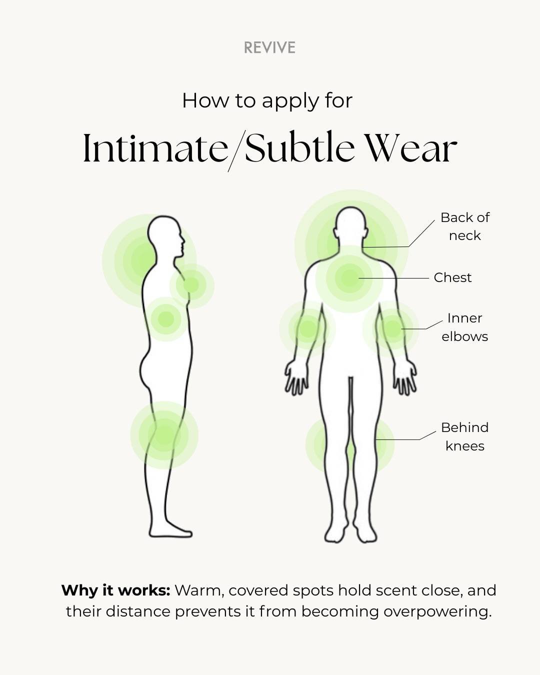 Zonele calde și acoperite mențin parfumul aproape de piele. Distanța lor față de nasul celorlalți previne ca parfumul să fie copleșitor.